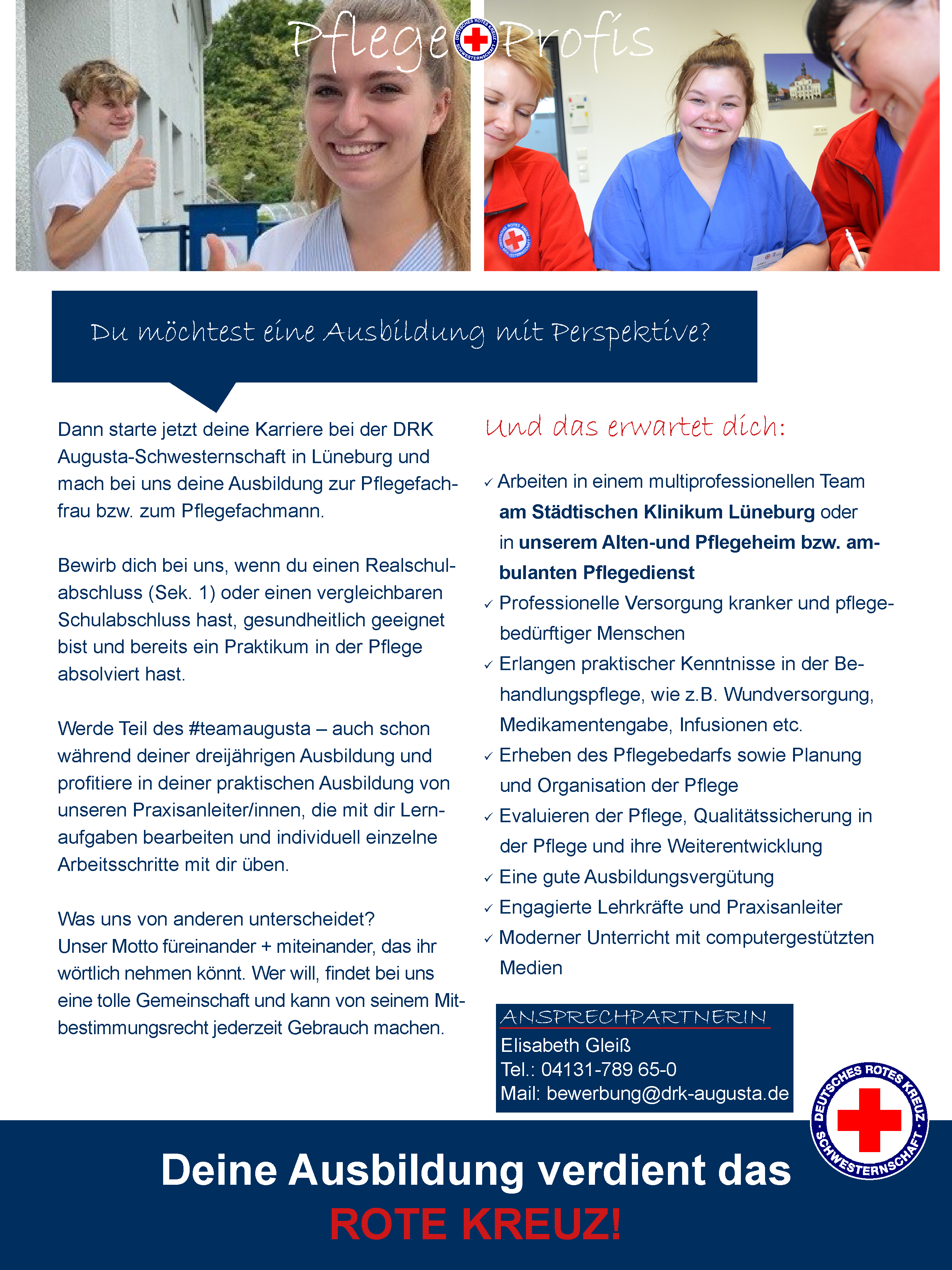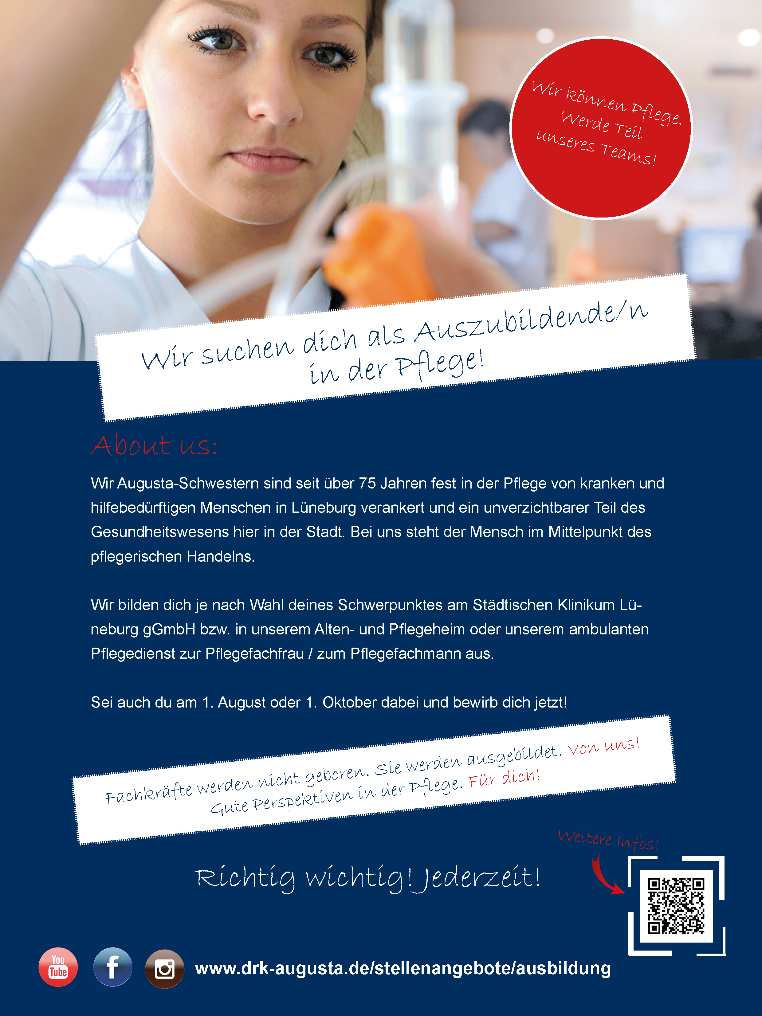 Weitere Infos findest du auch hier. Schau am besten gleich vorbei und bewirb dich entweder online mit unten stehendem Formular oder per E-Mail an: bewerbung@drk-augusta.de